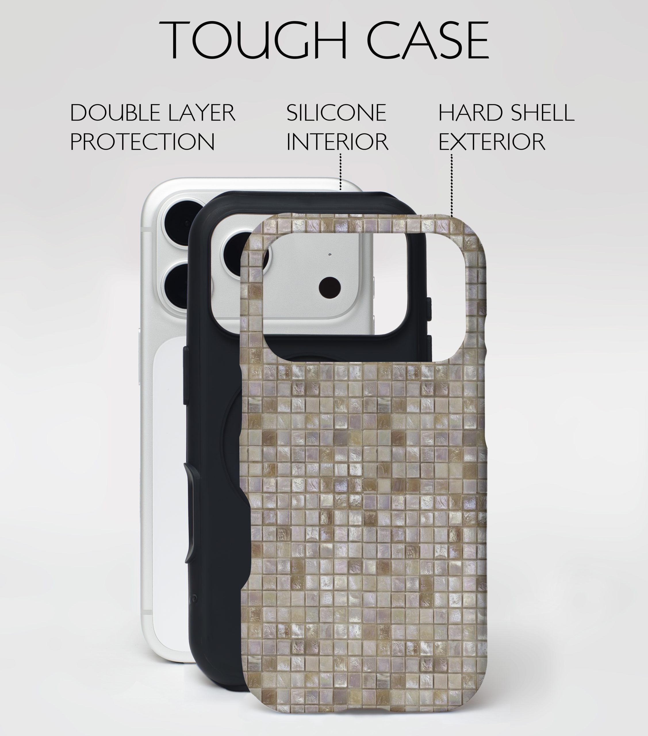 Understated luxury, delivered. This champagne-hued mosaic case features shimmering pearlescent squares that create a refined, timeless look. Elegant neutrals meet delicate shine—ideal for minimalists who still appreciate a hint of glamour.