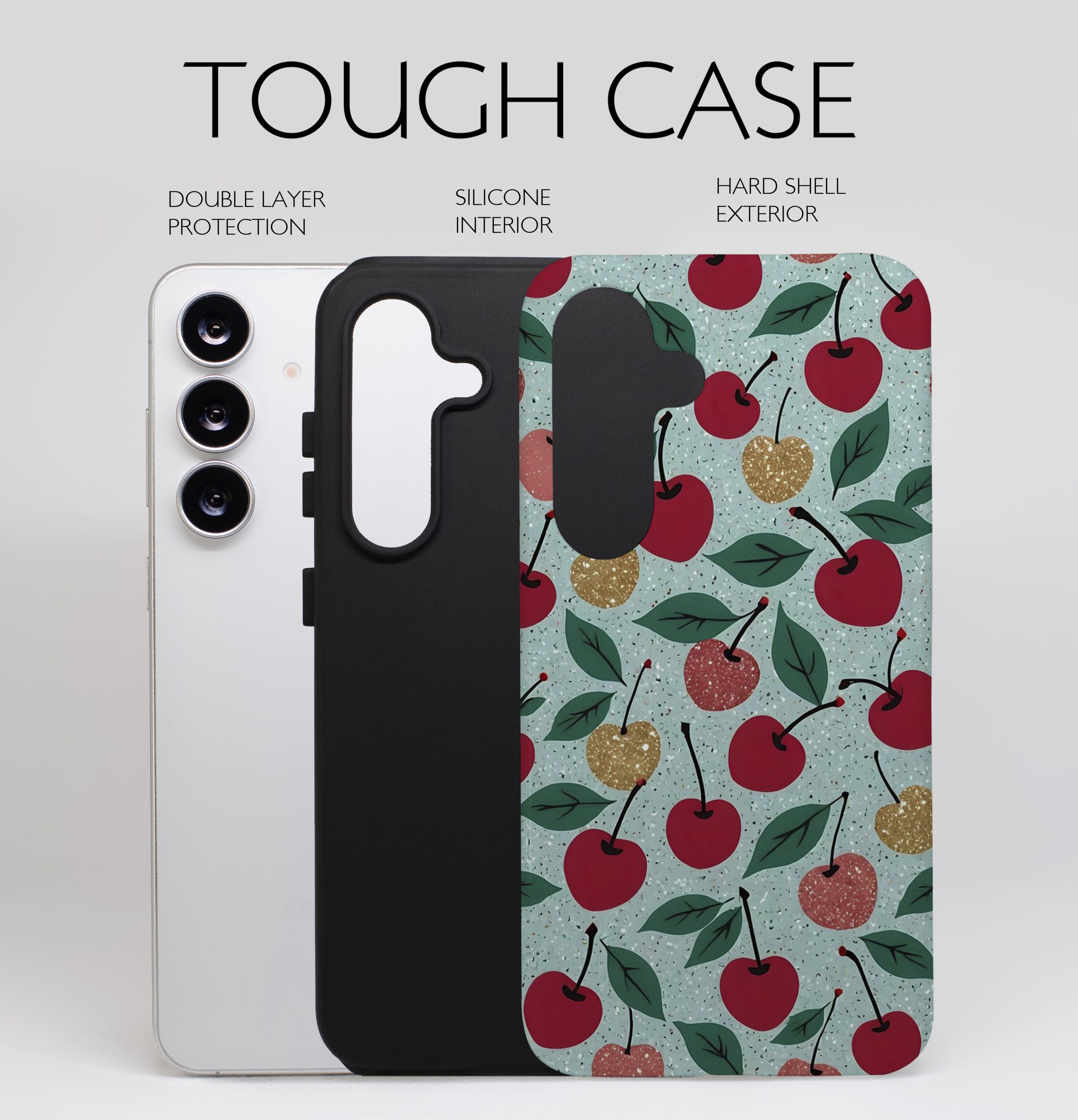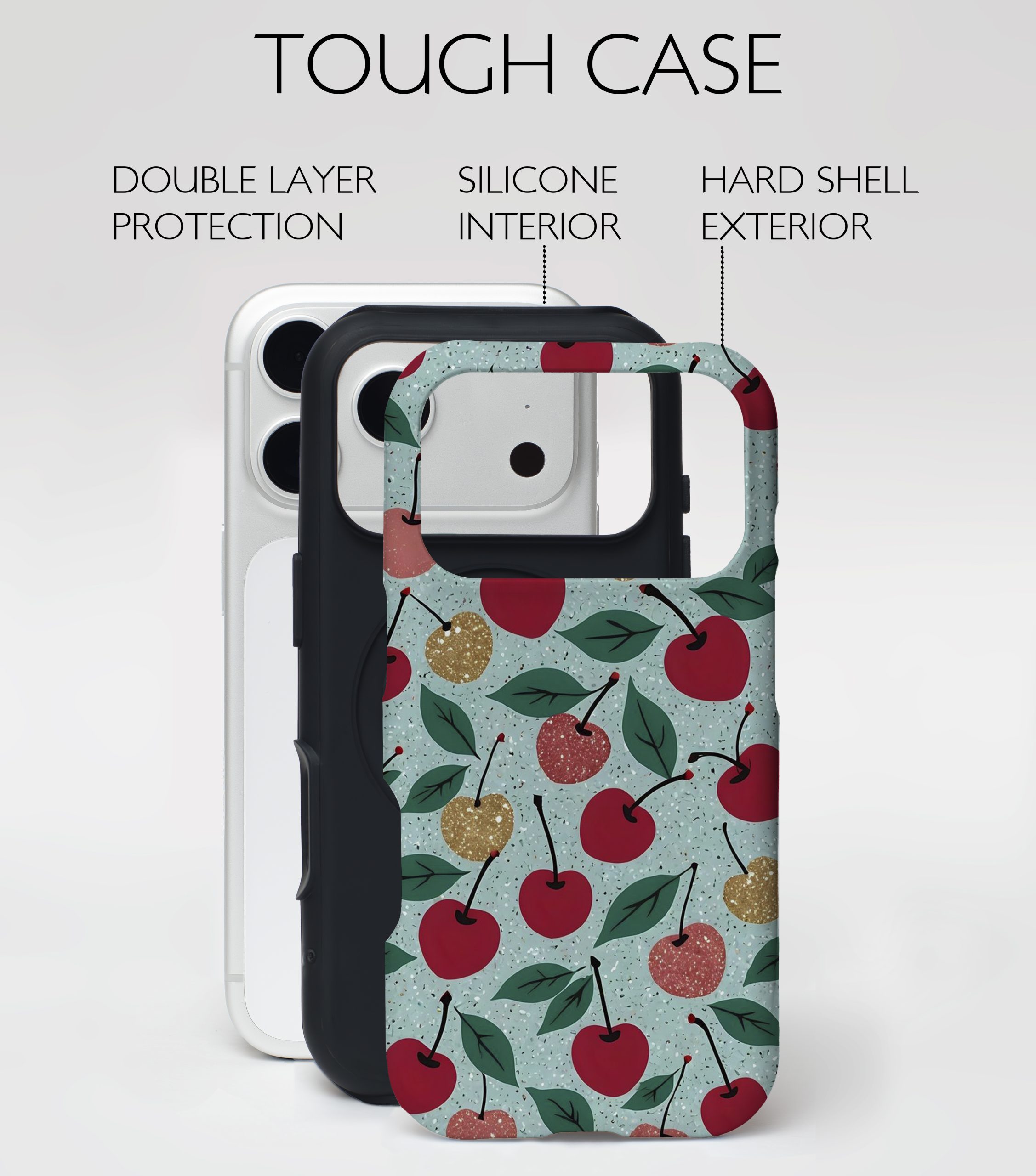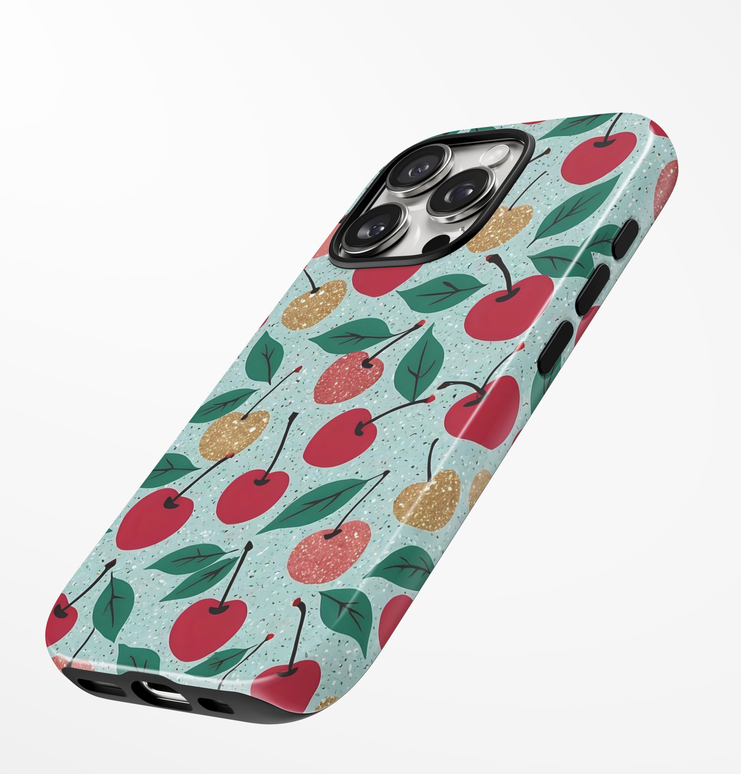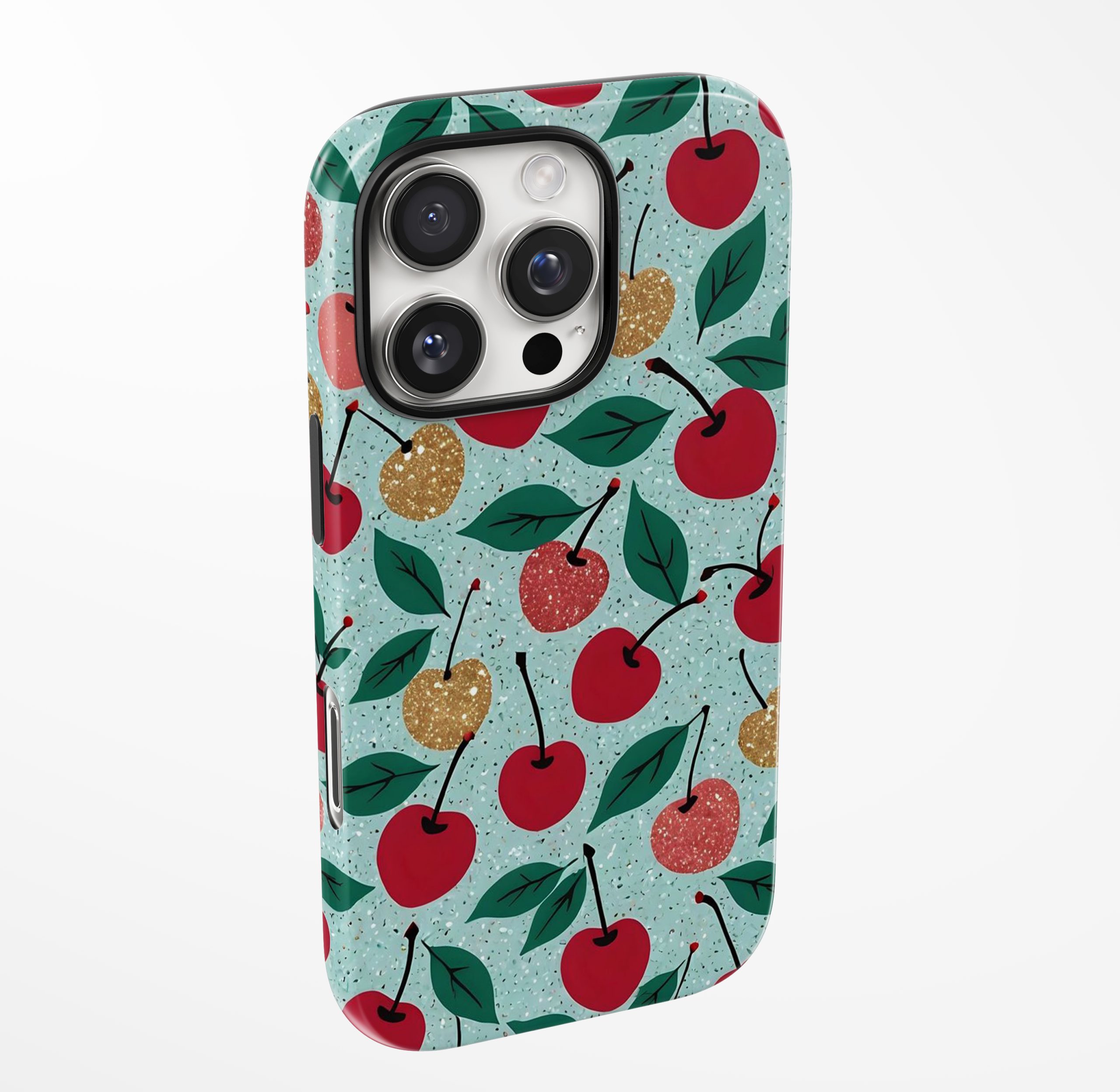 Sweet meets chic with Cherry Sparkle Delight — a playful twist on classic retro fruit patterns. Pops of glitter-gold cherries add the perfect touch of glam, while the soft mint background makes every element stand out.