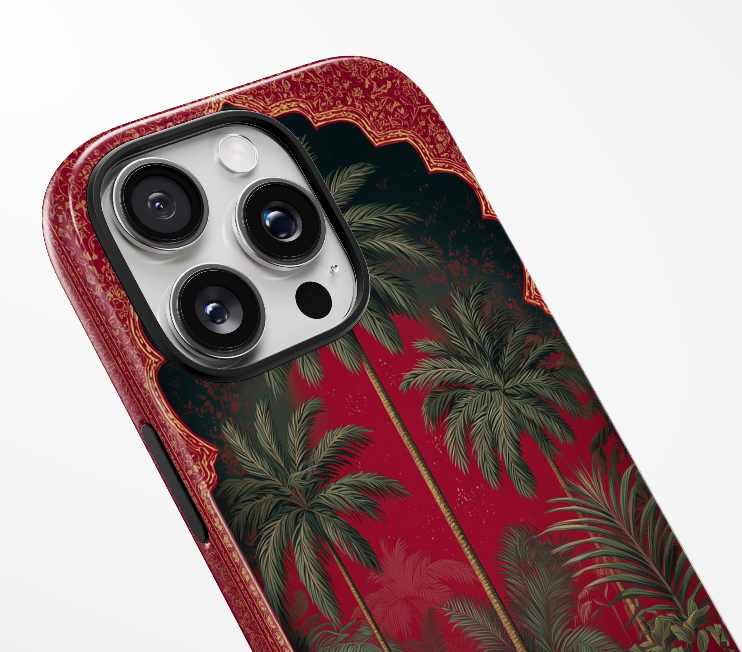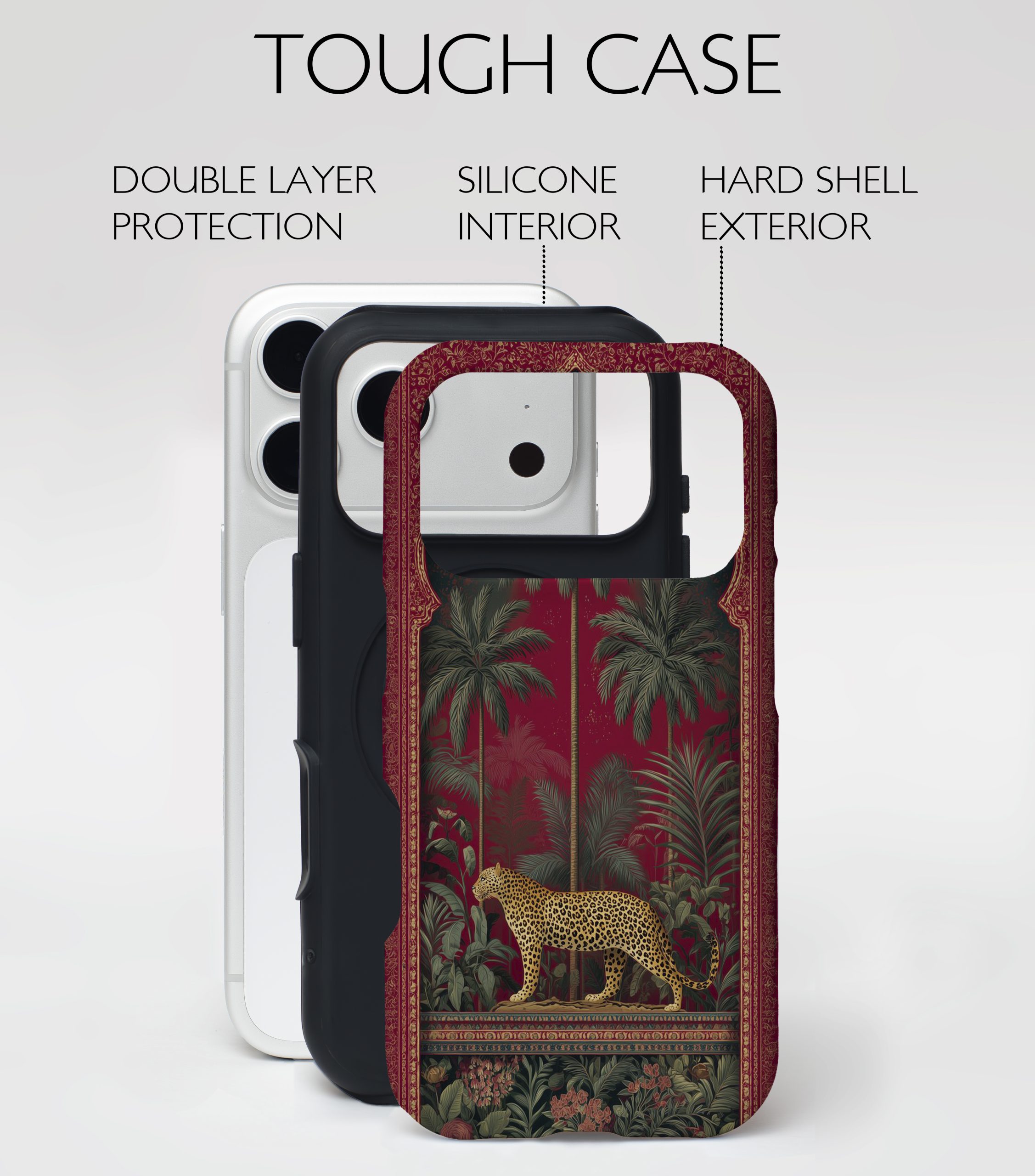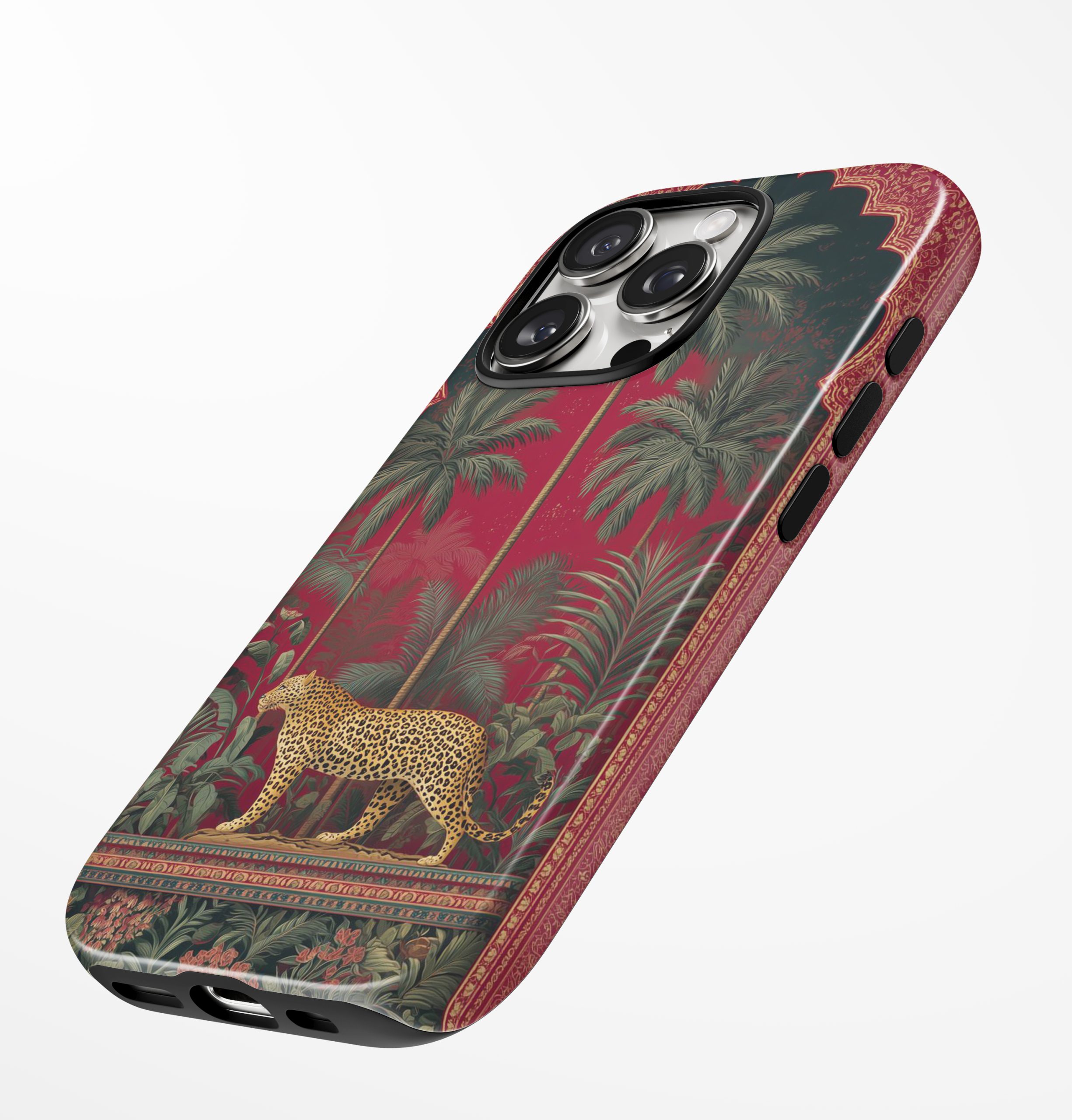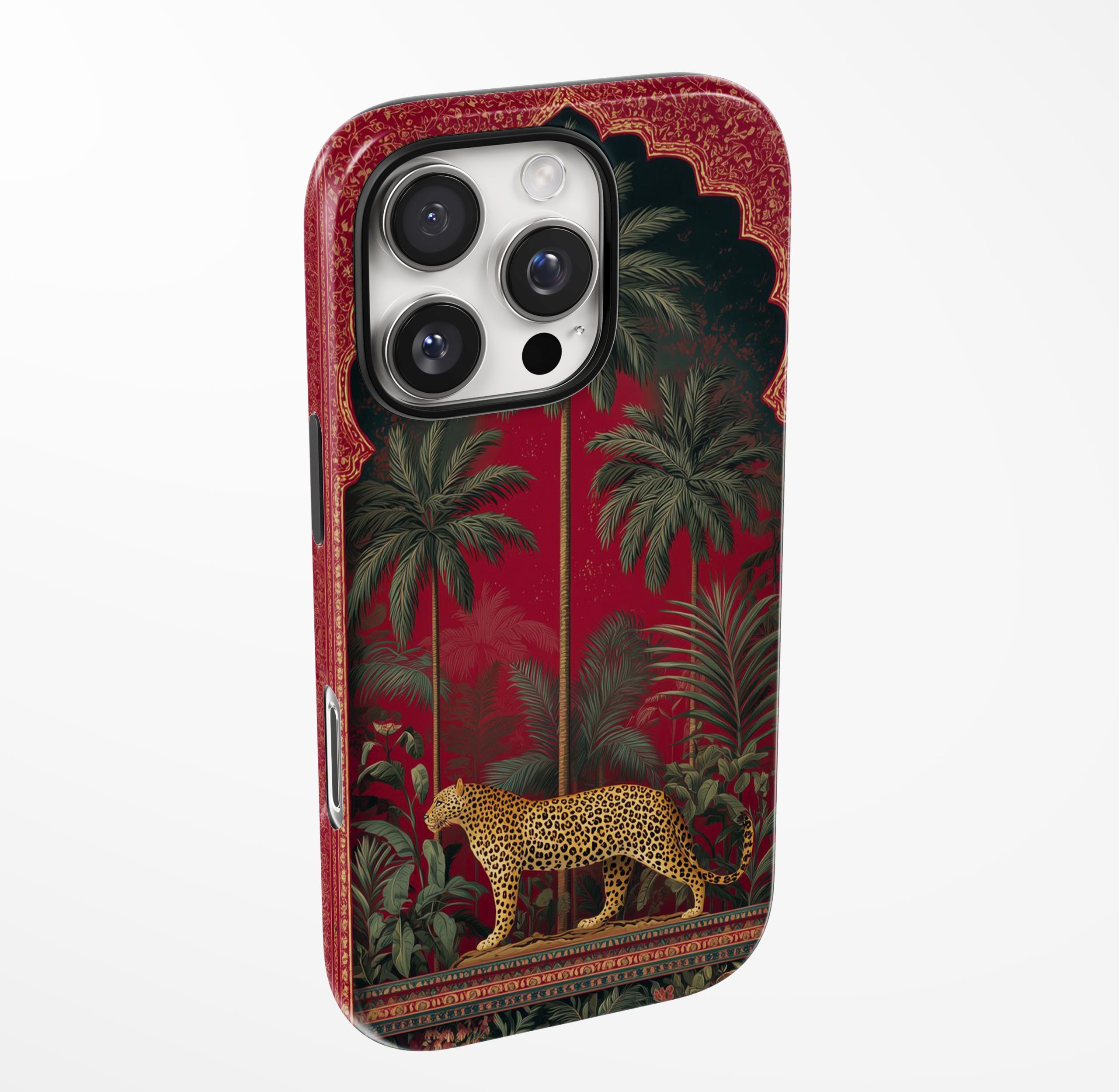Imperial Jungle Leopard brings ancient palace elegance straight to your everyday carry. With a rich ruby backdrop, grand arches, and lush tropical palms, this design frames a poised golden leopard—symbolizing power, grace, and effortless confidence.